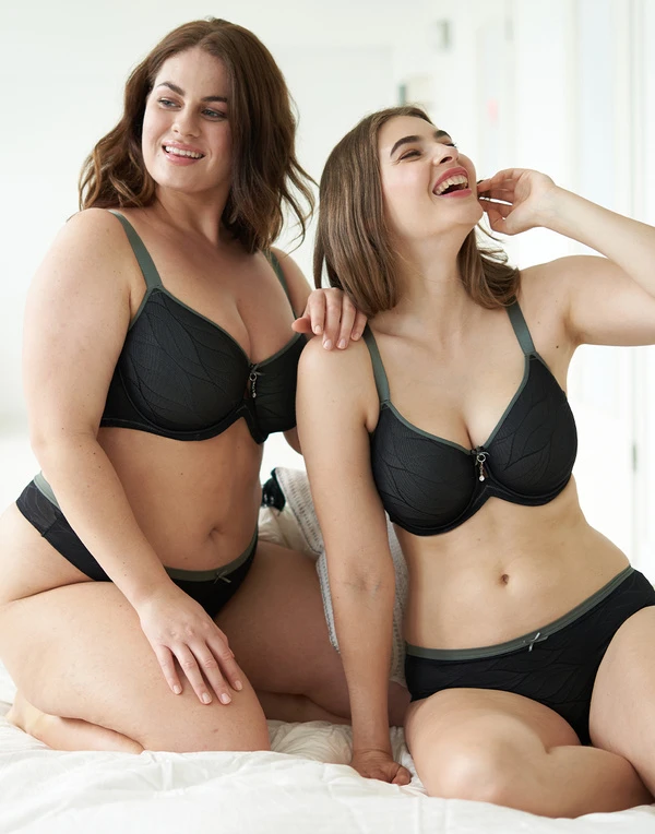 Unser Spacer-BH „Olivia“ kombiniert eine flache schwarze Spitze über einem olivefarbenem Grundmaterial.