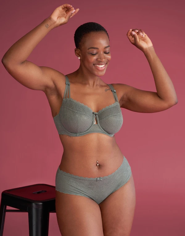 Kombiniere zu unserem Spitzen-BH „Sienna“ olive die passende Panty oder String!