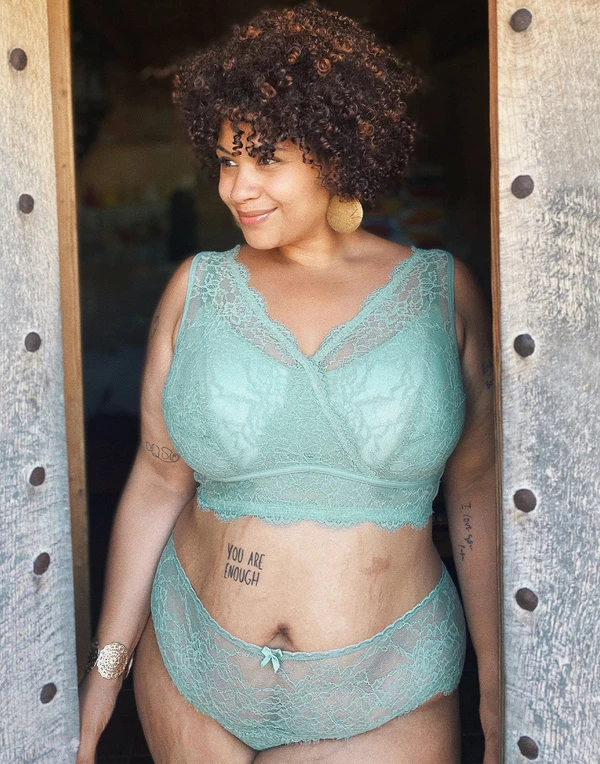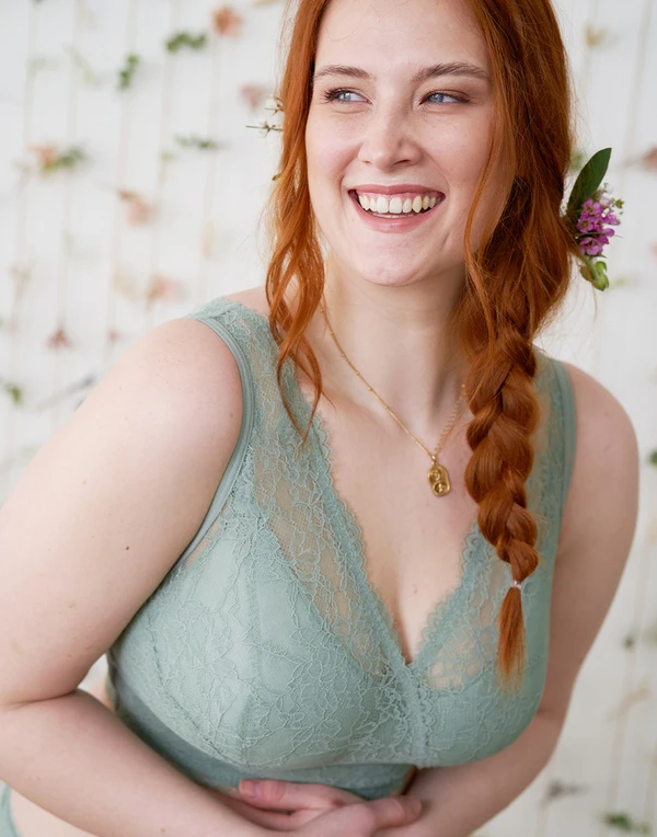 Ergänze den Look mit den farblich passenden Unterteilen String „Emilia“ sage oder Panty „Emilia“ sage.