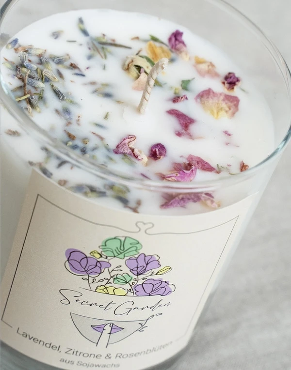 Unsere „Secret Garden“-Duftkerze aus Sojawachs hüllt Dein Zuhause in einen angenehm leichten Duft von Lavendel, Zitrone und Rosen und schenkt Dir frühlingshafte Leichtigkeit.
