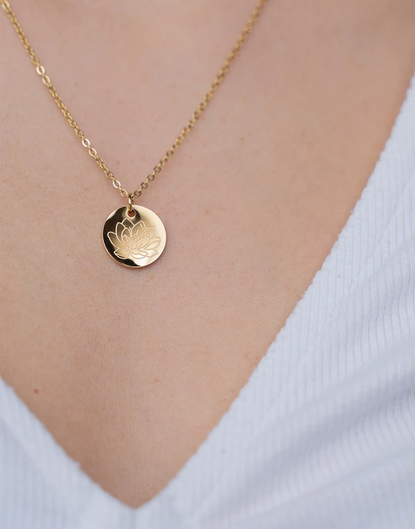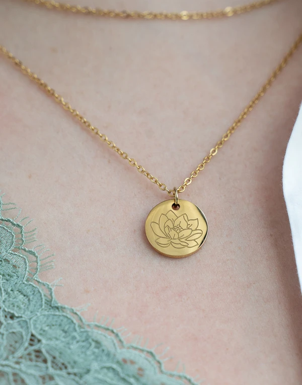 Die mit 18 Karat vergoldete Kette „Lotus“ aus nickelfreiem Edelstahl mit einer eingravierten Lotus-Blume passt perfekt zu unseren „Secret Garden“ Styles und natürlich auch zu allen anderen Dessous!