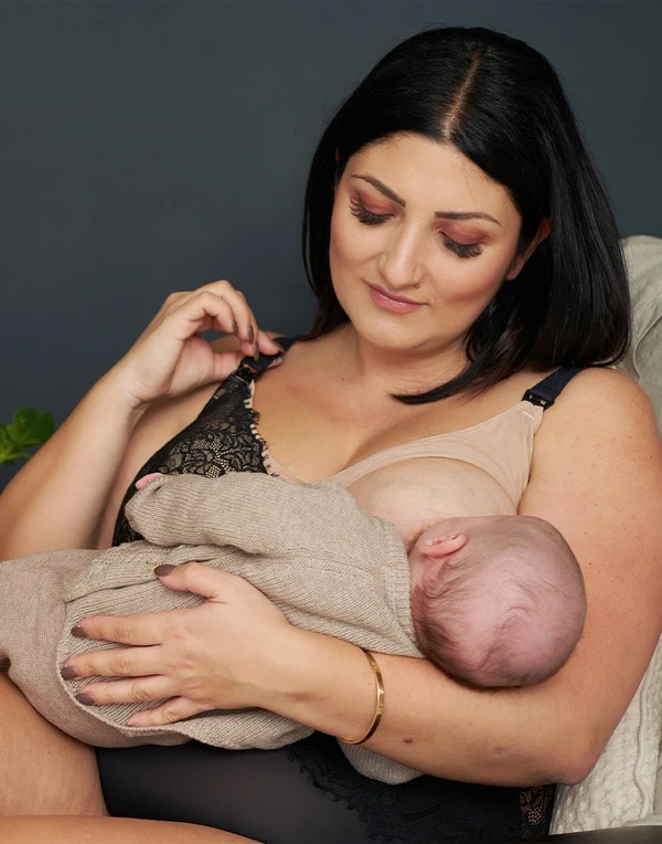 Unser Still-Bralette „Sophia“ ist Dein neuer bügelloser Lieblings-Begleiter den Du schon in der Schwangerschaft tragen kannst und in der Stillzeit nach der Geburt. Es lässt sich ganz einfach vorne öffnen und ist damit sehr angenehm in der Handhabung. Durch die florale Spitze und den Two-Tone-Look in Cappuccino und Black ist es alles andere als langweilig und sorgt für den gewissen Wow-Effekt.