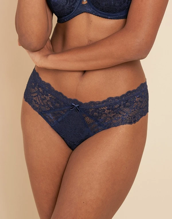 Unser String „Eliana Velvet“ navy bietet Dir durch die breiten Seiten einen extra hohen Tragekomfort. Gleichzeitig überzeugt er durch einen sexy Spitzen-Look und die verführerischen Samt-Details.