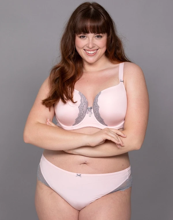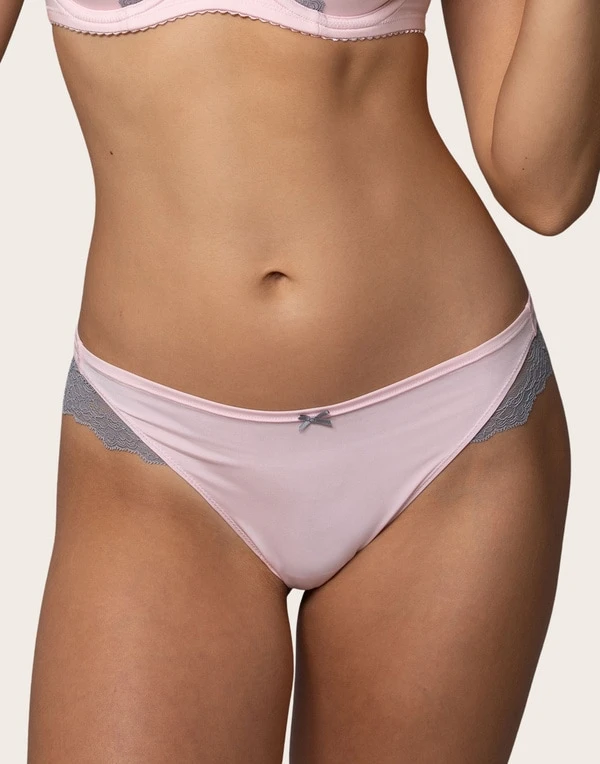 Unser String „Juliette“ kombiniert sinnliche Spitze in grau mit weichem Kontraststoff in rosa.